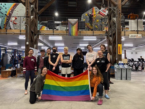We welcome all ages, experience levels, and identities at all our events. If there’s a link listed, RSVP so the gym knows you’re coming; otherwise, just show up. Dates are subject to change, so check our full calendar for updates. Remember to let the front desk staff know you’re at the gym for Queer Crush Climbing!